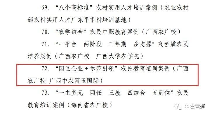 ▼廣西中農(nóng)富玉國際農(nóng)業(yè)科技有限公司榮獲“100個全國農(nóng)民教育培訓(xùn)發(fā)展典型案例”、“100個全國示范農(nóng)民田間學(xué)?!睒s譽稱號。