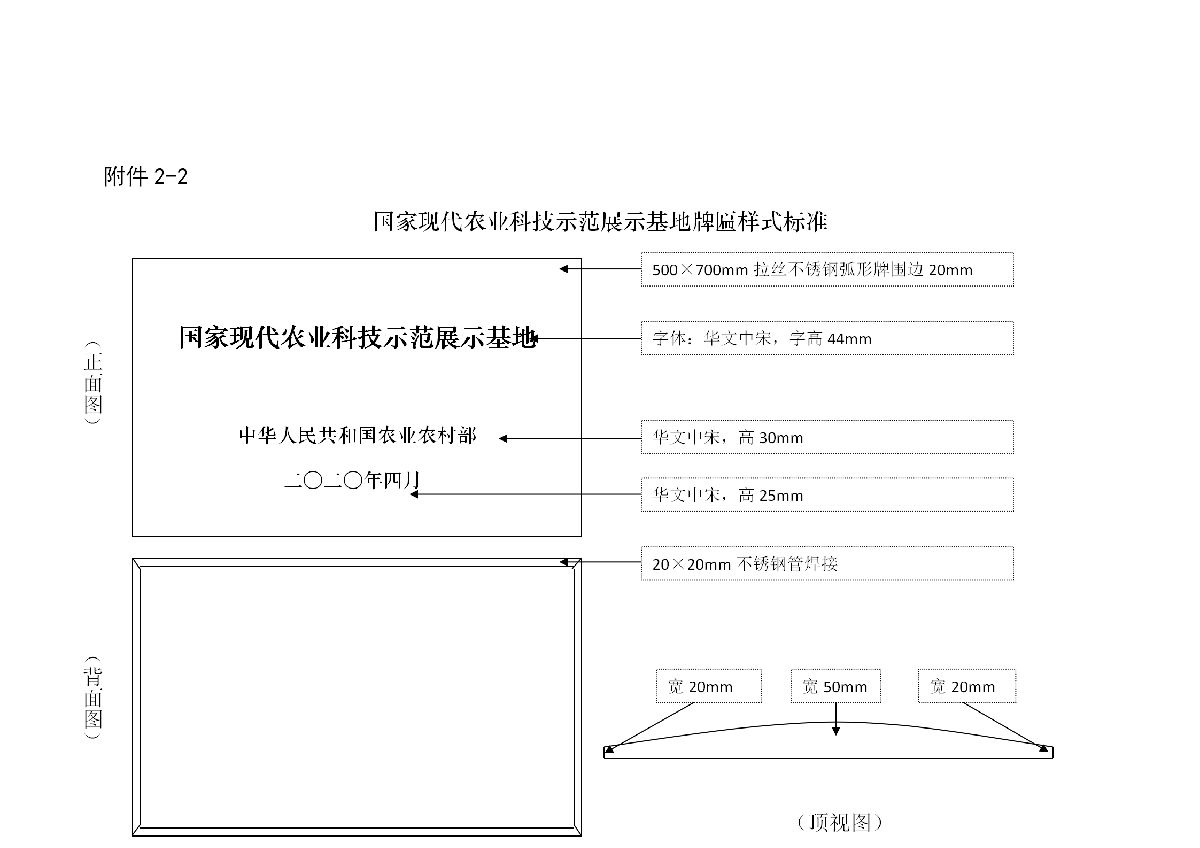 ?。ㄋ模┗貙嵭薪y(tǒng)一規(guī)范標牌標識,建設運營主體須在基地醒目位置豎立“國家現(xiàn)代農(nóng)業(yè)科技示范展示基地”標牌(標準樣式詳見附件2),標明示范技術(shù)、建設主體等內(nèi)容。